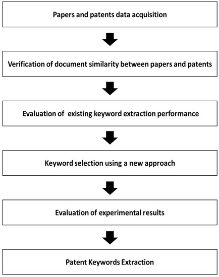 In particular, there have been a lot of studies focusing on the quantitative analysis of unstructured data, including patents, by applying text mining. Since patent analysis using text mining is based on words included in patent documents, the process of noise term removal and keyword extraction are preceded. As the extracted keywords have a significant influence on the subsequent analytic results, it is important for researchers to check if they are valid or not. However, most keyword-based patent analyses do not evaluate the validity of these keywords [4]. In addition, although the criteria for extracting keywords may vary according to the purpose of the analysis, most studies use the keyword extraction criteria to tell how well the collected patents can be classified based on the extracted keywords, which implies the technical characteristics. In this regard, the frequency–inverse document frequency (TF-IDF) method is the most frequently used [5,6,7,8]. However, the keywords selected by this criterion can be useful for a limited range of patent analysis, but are not suitable for patent analysis without any limited scope. Therefore, it is necessary to study the keyword extraction and performance evaluation methods that are able to consider the unique characteristics of a single patent document, without limiting the range of analysis. In addition, keyword selection of a single patent document is important because of the invariant. The keywords extracted from the patent portfolio can be changed whenever the patents constituting the portfolio are changed. Therefore, it is necessary to study the keyword extraction and performance evaluation methods that can show the unique characteristics of a single patent document regardless of the patent portfolio. In this study, we propose a methodology to extract the unique keywords of a single patent and evaluate its performance. When there are specific keywords in a document designated by its authors, they can be regarded as the terms that best represent the characteristics of the document. However, a patent document does not include specific keywords chosen by its inventors. This study is aimed at developing a method of extracting keywords from patent documents based on relevant papers whose content is similar to the target patents and their authors’ keywords.