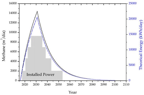 The application LandGEM (Environmental Protection Agency EPA, North Carolina, USA) was used to determine QCH4. The environmental parameters k and Lo have were from the reference in studies by Ordoñez in Colombia [52] and Scarlat in Africa [55]. They reported values of k = 0.08 and LO = 84. Both parameters correspond to an annual precipitation over 1000 mm/year [56]. In Colombia, the average annual precipitations are in the order of 3240 mm [57]. Obtaining QCH4 is important because the electric power generated by the biogas depends on this variable, as described in Equation (5), for an electrical efficiency and biogas recovery of 80% and 33%, respectively [58,59].