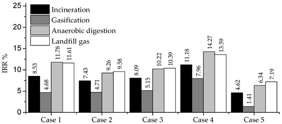 The results in Figure 4 clearly show the positive effects of tax incentives on the IRR of all the technologies in Cases 3, 4, and 5. The highest profitability is achieved with anaerobic digestion, due to the treatment of organic waste. In second place is landfill gas because of the income generated per received ton of waste. The profitability of the remaining technologies is lower due to the high investment cost.