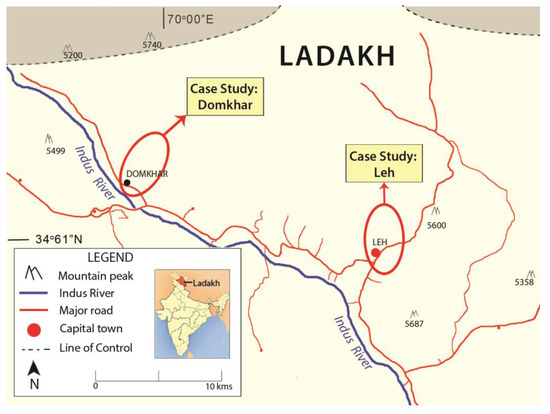 Location map of Ladakh and case study sites of Domkhar and Leh, Western Himalayas.