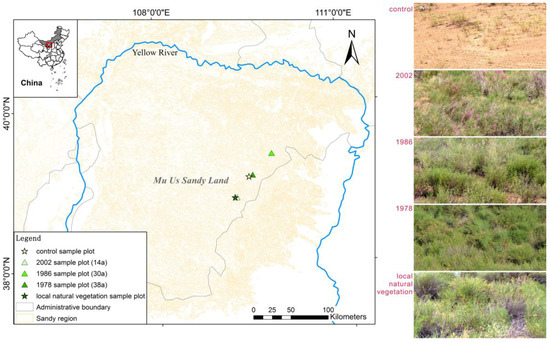 The study was conducted in the hinterland of the Mu Us Sandy Land (37°27′30′′ N–39°22′30′′ N, 107°20′ E–111°30′ E), in Wushen County and Yinjinhuoluo County, Inner Mongolia, China. The altitude ranges from 1200 m to 1600 m in the study area. The annual average temperature is 6.0–8.5 °C, annual rainfall is 250–440 mm, and most of it falls in August. The zonal vegetation in the region is a part of the Eurasian steppe; because of the sand matrix and special climate conditions, semi-fixed and fixed sand dunes are widely distributed. Common shrub species in the research region include Artemisia ordosica Krasch, Salix cheilophila Schneid., H. laeve, Caragana intermedia Kuang et H. C. Fu and Sabina vulgaris Ant. [21].