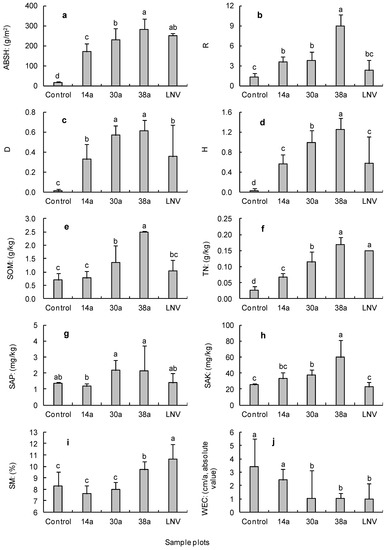 (a) Changes of ABSH (Aboveground biomass per unit area of shrub (ABS) + Aboveground biomass per unit area of herb (ABH)) of the sample plots; (b) Changes of R (Richness index) of the sample plots; (c) Changes of D (Simpson index) of the sample plots; (d) Changes of H (Shannon–Wiener index) of the sample plots; (e) Changes of SOM (Soil organic matter) of the sample plots; (f) Changes of TN (Total nitrogen) of the sample plots; (g) Changes of SAP (Soil available phosphorus) of the sample plots; (h) Changes of SAK (Soil available potassium) of the sample plots; (i) Changes of SM (Soil moisture) of the sample plots; (j) Changes of WEC (Wind erosion spile height change) of the sample plots; LNV means local natural vegetation.