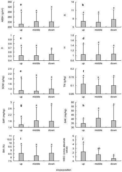 (a) Changes of ABSH (Aboveground biomass per unit area of shrub (ABS) + Aboveground biomass per unit area of herb (ABH)) at different slope positions for H. laeve shrubs; (b) Changes of R (Richness index) at different slope positions for H. laeve shrubs; (c) Changes of D (Simpson index) at different slope positions for H. laeve shrubs; (d) Changes of H (Shannon–Wiener index) at different slope positions for H. laeve shrubs; (e) Changes of SOM (Soil organic matter) at different slope positions for H. laeve shrubs; (f) Changes of TN (Total nitrogen) at different slope positions for H. laeve shrubs; (g) Changes of SAP (Soil available phosphorus) at different slope positions for H. laeve shrubs; (h) Changes of SAK (Soil available potassium) at different slope positions for H. laeve shrubs; (i) Changes of SM (Soil moisture) at different slope positions for H. laeve shrubs; (j) Changes of WEC (Wind erosion spile height change) at different slope positions for H. laeve shrubs.