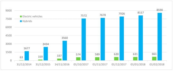 Increase of use of electric vehicles is explained by the desire to save environment, non-renewable energy sources, and reduce fuel costs [,,]. As of 1 February 2018 according to the local registrar of vehicles, the State Enterprise “Regitra” (Vilnius, Lithuania) 661 electric vehicles were registered in Lithuania (Figure 1). The most popular among them were Nissan Leaf (329 cars), Tesla’s model S (78 cars), and BMW i3 (57 cars), while 8590 cars of the M1 class hybrid vehicles (petrol/electric and diesel/electric) were registered. The most popular among them in the class diesel/electric were Toyota (5186 units), Lexus (2446 units), and Honda (403 units), and in the class petrol/electric were Chevrolet Volt (102 units), and Toyota Prius (24 units).