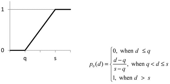 The PROMETHEE II method [] uses some general ideas of MCDM framework; nevertheless, it discerns to a high extent from other MCDM methods. The preference functions of chosen shapes (the shape is represented by the index t) normalize values of criteria, or, more precisely, of differences di between values of criteria in pairs (Aj, Ak) compared. The method compares all such pairs and creates a cumulative criterion based on such comparisons. Choice of parameters q and s enhances the evaluation by providing more options and has influence on the result []. The cumulative criterion is calculated in two steps. First, for every alternative and all remaining alternatives , two inward and backward aggregated preference indices and are calculated in accordance with the following Formula (27):