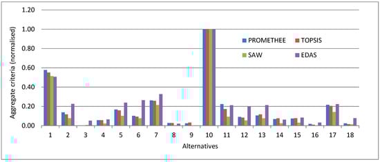 Normalised values of aggregate criteria of all four methods for 18 alternatives are presented in Figure 3.