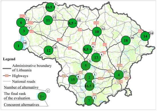 The state of the public infrastructure for electric vehicles in cities and resorts of Lithuania. Notes: Alternatives are cities of Lithuania: 1—Birštonas, 2—Druskininkai, 3—Alytus, 4—Jonava, 5—Kaunas, 6—Kėdainiai, 7—Klaipėda, 8—Marijampolė, 9—Mažeikiai, 10—Neringa, 11—Palanga, 12—Panevėžys, 13—Šiauliai, 14—Tauragė, 15—Telšiai, 16—Utena, 17—Vilnius, 18—Visaginas, authors’ calculations.