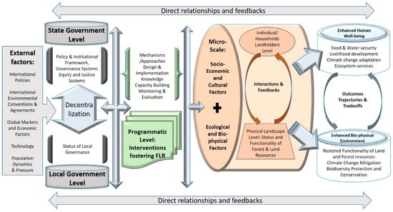 The publications in this review highlight the importance of effective governance of FLR as a scheme and of an enabling governance context for fostering FLR. Governance systems, defined as “the ways and institutions through which individuals and groups express their interests, exercise their rights and obligations, and mediate their differences” [] (p. 26), significantly shape SLM and FLR outcomes. Wilson and Cagalanan [] analyzed existing and potential innovative governance approaches for FLR success. They propose that “successful governance approaches should be people-centered, adaptable to local contexts and needs, engage a range of stakeholders across different scales and sectors, and be flexible to incorporate local practices and ideas, and changes in these over time” [] (p. 11).