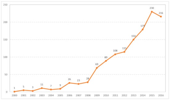 The articles of PSS research were collected from SCOPUS, which is one of the largest databases of academic publications covering a wide range of multidisciplinary journals and proceedings. SCOPUS was also used in the recent reviews of PSS [5,6,9]. We extracted articles including the keywords “product service system” in their titles, abstracts or keywords section. It was confirmed that “product service system” and “product-service system” generated the same set of publications. The document type was limited to article, article in press, review, conference paper, and book chapter. The publication period was restricted to between 2000 and 2016 because very few articles on PSS were published before 2000. An initial set of 1269 documents were obtained from the keyword search, and by excluding those documents whose abstract is not available, a total of 1229 articles were produced as the dataset for this study. The database includes basic the bibliometric information of the articles such as titles, authors, journals, and publication year, abstracts, and references.