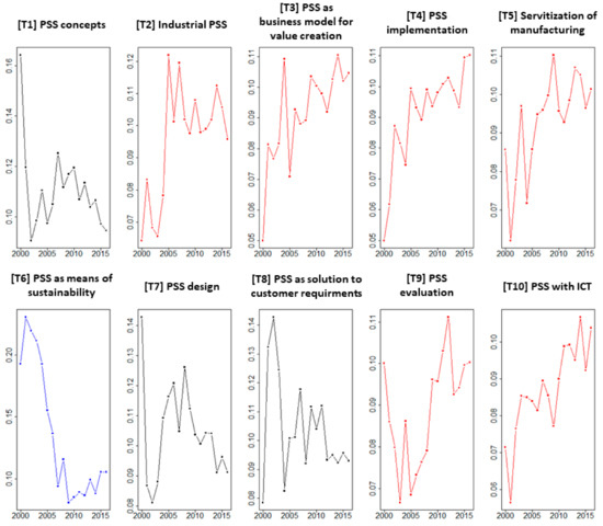 Accordingly, six hot topics, one cold topic, and three cool topics were identified as shown in Table 4, and no warm topic was found. Figure 3 represents the proportion changes of the ten topics over time. A noticeable finding is that (T6) PSS as means of sustainability is the only cold topic. Its proportion exceeds 20% in the early 2000s but has shown a dramatic drop to below 10%. This empirically confirms the assertion made in the recent review: “PSS started its development linked to sustainability, but nowadays it is no longer the most influential aspect in PSS research [9].” Although this does not indicate that PSS no longer contributes to sustainability, it seems obvious that sustainability is no longer central to discussions of PSS.