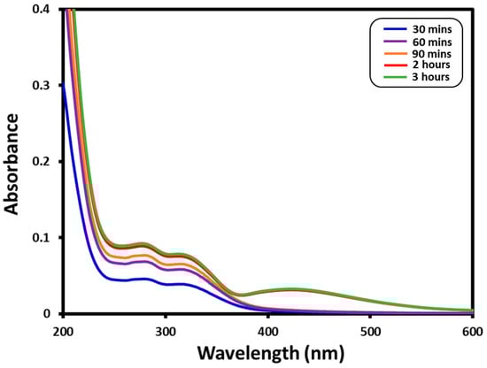 The ecofriendly synthesis of AgNPs was performed under a reflux environment using Saudi O. vulgare L. extract. The Ag+ ion reduction was confirmed by the apparent transformation in the color of the reaction mixture from light brown to dark brown. Indeed, no color transformation was noticed in the absence of plant extract, under a similar set of circumstances. The formation of AgNPs was further confirmed by UV–Vis spectral study, which is an authentic technique to monitor the progress of the reaction during the reduction of Ag+ ions. For this purpose, UV–Vis spectra of green synthesized AgNPs prepared at 90 °C (OV-Ag) were measured at regular intervals of time as displayed in Figure 1. The kinetics of the reaction monitored by UV–Vis analysis revealed that the reaction was slow in the beginning; indeed, up to 90 min from the start of the reaction, no indication of the formation of NPs was observed (no Ag peak). After 90 min, the nucleation was initiated very rapidly and the formation of AgNPs occurred very fast until around 30 min had passed. This is clearly reflected by the sudden appearance of the characteristic band of AgNPs at ~430 nm after 120 min of reaction time (red line in Figure 1). The reaction was allowed to continue further and no considerable change was observed in the intensity of the Ag peak, which points towards the completion of the reaction in ~120 min.