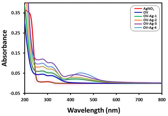 UV–Vis spectral analysis of O. vulgare L. extract (OV), OV-Ag-1, OV-Ag-2, OV-Ag-3, and OV-Ag-4. All of the reactions were conducted for a duration of 3 h, and the UV–Vis spectral analyses were carried out after sample final workup.