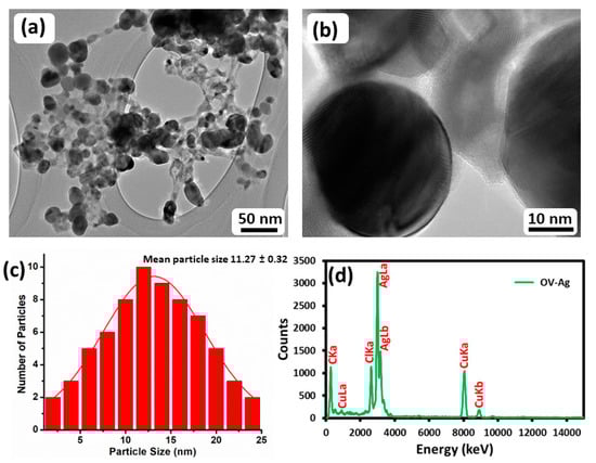 (a,b) High-resolution transmission electron microscopy pictures of the OV-Ag NPs; (c) Particle size distribution graph of OV-AgNPs; and (d) EDX of OV-AgNPs.
