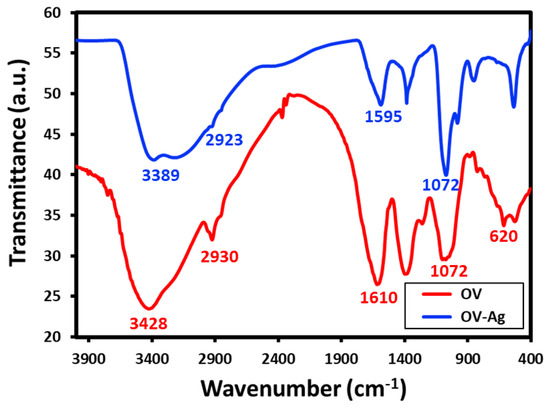 The dual role of the plant extract as a reducing and stabilizing or capping agent was recognized by comparing the FT-IR spectra of pristine O. vulgare L. plant extract and as-synthesized OV-AgNPs as displayed in Figure 5. In order to exclude any possibility of the presence of unbound residual organic moieties, the resultant AgNPs were repeatedly centrifuged and redispersed in DI water. This has clearly reduced the chances of the contribution of phytomolecules to FT-IR, XRD, and TEM results. As presented in Figure 5, the FT-IR analysis of OV-AgNPs is closely identical to the FT-IR spectrum of pristine O. vulgare L. extract, excluding some marginal shifts in few peaks. This similarity clearly indicates that some of the residual moieties of the phytomolecules from the O. vulgare L. extract stayed on the surface of the as-synthesized OV-AgNPs. The FT-IR spectrum of O. vulgare L. extract exhibits several absorption peaks at different locations including at 3428 cm−1, ~2930 cm−1, ~1610 cm−1, and ~1072 cm−1, which are associated with the several oxygen-comprising functional groups. A majority of the peaks also exist in the FT-IR spectrum of OV-AgNPs with few marginal shifts. For example, all the aforementioned peaks are marginally shifted in the FTIR spectrum of OV-AgNPs and exist at ~3389 cm−1, ~2923 cm−1, ~1595 cm−1, and ~1072 cm−1. Consequently, the occurrence of these peaks in the FT-IR spectrum of OV-AgNPs evidently indicates the dual role of the O. vulgare L. extract, both as a green reducing agent and as a stabilizing agent.