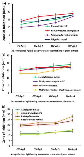 The AgNPs, i.e., OV-AgNPs prepared with employing various concentrations of O. vulgare L. plant extract, were subjected to antimicrobial evaluation against various Gram-positive and Gram-negative bacterial strains as well as fungal strains. During the study, it was found that all the as-prepared NPs displayed significant antimicrobial activity and the results obtained against both Gram-negative (E. coli, P. aeruginosa, S. typhi, and S. sonnei) and Gram-positive (M. luteus, S. epidermidis, Methicillin-resistant Staphylococcus aureus (MRSA), and S. aureus) bacterial strains and pathogenic fungi (A. flavus, A. alternate, P. alba, and P. variotii) are graphically represented as a zone of inhibition (diameter) in Figure 6 and tabulated in Table 1 and Table 2. It is apparent from the results that the plant extract does not display any microbicidal activity up to 300 µg of plant extract; however, the AgNPs prepared by employing the plant extract display microbicidal activity. It is also observed upon changing the concentration of the PE for the synthesis that there is variation in the microbicidal activity effected by the OV-AgNPs. As the concentration of plant extract increases, the antimicrobial activities of OV-AgNPs also increased significantly. The highest activity was obtained with the OV-AgNPs prepared using 7.5 mL of plant extract against Gram-positive bacteria, Gram-negative bacteria, and pathogenic fungi. Similar variation in the microbial activity was also observed in our earlier study wherein Pulicaria glutinosa plant extract [52] was employed for the synthesis of AgNPs. This behavior can be attributed to the increased NP solubility due to the larger presence of the plant extract on the surface of the nanoparticles. These phytomolecules played a dual role of both reducing the metal salt and stabilizing the resultant NPs. The increased solubility will enhance the permeation of the nanoparticles through the bacterial cell wall, inducing a disturbance in the cell mitosis metabolism, leading to cell death. In this present study, the OV-Ag-4 displayed the best activity against the tested bacterial and fungal strains, among the AgNPs (OV-Ag-1, OV-Ag-2, OV-Ag-3) prepared. The highest zone of inhibition (19 mm) was obtained against P. aeruginosa and S. aureus, when OV-Ag-4 was employed; however, when the same nanoparticle (i.e., OV-Ag-4) was employed against the fungal strains, A. alternate, the zone of inhibition of 28 mm was obtained. However, the zone of inhibition was found to be in the range 12–19 nm for bacterial strains, while a zone of inhibition of 12–28 nm was obtained when the prepared nanoparticles were employed against fungal strains.