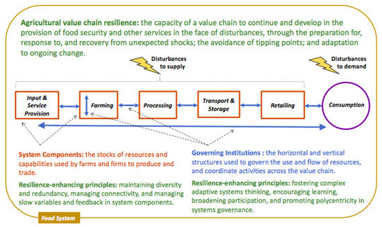 Despite its recognized importance to food system performance, agricultural value chain resilience has received very little attention in SES or value chain research (as one exception that focuses on a developing country context, see Smith et al. (2016)) [33]. In contrast, in recent years the SCM disciplines have developed a significant body of research focused on the concept of supply chain resilience. As Kamalahmadi et al. (2016) describe, this literature has emerged out of a growing consensus that supply chain risk management practices have not been sufficient to deal with many types of disturbances to which supply chains are vulnerable, namely those that are difficult to quantify ex ante [8]. While the supply chain resilience perspective has relevance for addressing predictable disturbances, its great importance lies in its potential to address disturbances that are difficult to identify in detail or for which reliable statistical information is not available. Chopra and Meindl (2016) identified two types of uncertainty that are associated with disturbances affecting supply chains. First, demand uncertainty refers to disturbances to market demand for the particular products and services that a supply chain provides to consumers [34]. Second, supply uncertainty refers to disturbances that affect the flow and value addition of products within the supply chain to their point of distribution to the consumer. These disturbances can originate from the environment outside the value chain system, as well as from within [35]. Because many supply and demand disturbances originate outside a value chain system (e.g., high frequency of drought, poor infrastructure, or unstable policy environments), a given commodity chain will likely face different levels of potential disturbances depending on its context (across time, countries, regions, etc.). As an example, Leat and Revoredo-Giha (2014) discuss in detail the different disturbances threatening a major Scottish pork value chain in the 2000s. Disturbances affecting demand included increased competition from imports and volatile exchange rate movements, while disturbances affecting supply included disease outbreaks, non-payments from processors, changing regulations on animal welfare and waste disposal [36].