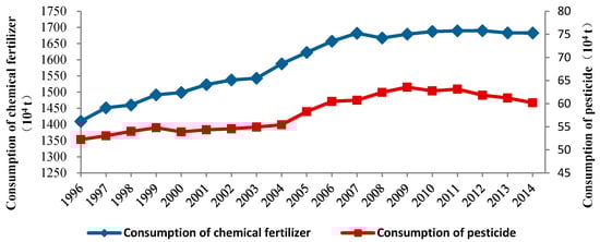 | Year | Consumption of Chemical Fertilizer (104 t) | Consumption of Pesticide (104 t) | Agricultural Output Value (1012 ¥) |