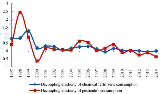 - The stage of week decoupling (during 2000–2009). The decoupling elasticity is 0~0.8. Agrochemical input consumption and agricultural output value were basically in the growth phase, and agrochemical input consumption grew more slowly. The year of 2001 is seen as an important year of the source reduction control of agricultural non-point source pollution, because the policies of prevention and control of non-point source pollution were put forward in the 9th five-year plan on national economics and society development of China. In view of the actual situation, the control in Eastern China was executed earlier. It shows that the source reduction control policy of agricultural non-point source pollution gradually played a role, but the dependence on agrochemical to agricultural economic growth was hard to recind quickly.