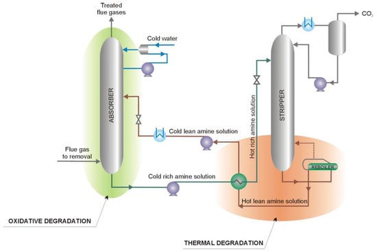 Flue gas streams from coal fired boilers are usually composed of nitrogen with 10–20 vol. % of CO2 and 5–10 vol. % of O2 [21] with contaminants, such as 500–3000 ppm(v) SO2, 20–30 ppm(v) SO3 with an assumed 20–30 ppm(v) of NOx. However, NOx is nominally 5–10 vol. % NO2 and 90–95 vol. % NO, and only NO2 reacts with MEA to degrade products [22]. There are also many other impurities contained in flue gas, such as H2S, hydrocarbons, heavy metals, and fly ash. In these conditions, three types of solvent degradation can occur: carbamate polymerization, thermal degradation, and oxidative degradation. The zones or equipment sections in a post-combustion system where solvent degradation is observed are presented in Figure 1.