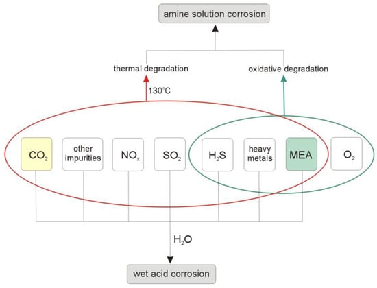 Oxidative degradation is the dominant type of amine degradation in the post combustion capture (PCC) process based on MEA. It mainly takes place in the absorber section (absorber sump and absorber packing) where oxygen concentration is highest but it may also occur in piping leading to the cross exchanger and in the cross exchanger itself due to the presence of dissolved oxygen in the CO2 (rich amine solvent). For oxidative degradation to occur, oxygen with a maximum concentration of 5 vol. % of the flue gas stream must be present [23]. The forming of amine degradation and types of corrosion are presented in Figure 2.