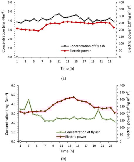 The observed fly ash emissions to the atmosphere during the studied time period typically did not exceed a concentration of 5 mg·Nm3 and did not exhibit a significant dependence on power plant output, unlike the case of SO2. The fly ash concentration values were within the following range: 3.8–4.7 (Cs) and 2.1–4.5 (BCs). The observed greater concentration deviations for the coal and biomass sample (Figure 4a,b) were a result of brief fly ash concentration increase occurrences, even as much as over 20 mg·Nm3.