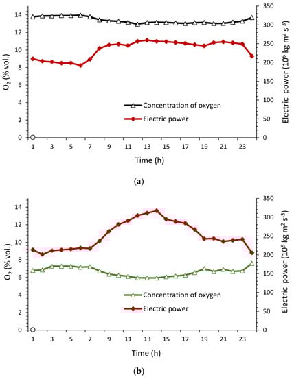 The range of oxygen concentration between during 24 h period was given as a monthly average for fuel samples and gave the values of, respectively: Cw (9.3–11.1 vol. %); Cs (12.9–13.9 vol. %); BCw (6.3–7.4 vol. %), and BCs (5.9–7.6 vol. %). Dependence of the power plant’s actual output on the oxygen concentration for samples Cs and BCs is presented in Figure 5a,b respectively.