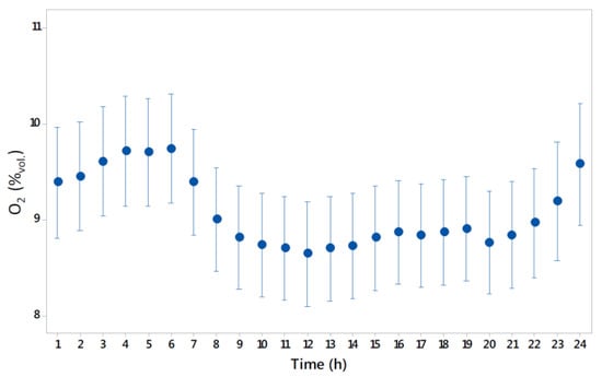 First, the normality of the O2 was checked by means of the Anderson-Darling Test, and a p-value lower than 0.05 was obtained, confirming that data does not follow a normal distribution. In order to achieve normality, a Box-Cox transformation was applied. The p-value of the Anderson-Darling Test for the transformed variable, indicates that it does not follow a normal distribution either and, therefore, the use of parametric tests was discarded. A non-parametric Kruskal-Wallis Test was conducted to the original variable. As the p-value was under 0.05, it can be established that there are significant differences between the median values of the original data for some hours of the days. In order to explore these differences from a graphical point of view, it is reasonable to use a monthly average value for each hour. In the next step, a confidence interval (CI) was plotted with a confidence level of 95% of the variable. The pooled standard deviation was used to calculate the intervals. It can be observed that there are significant differences between the confidence intervals of the mean values for different hours (Figure 6).