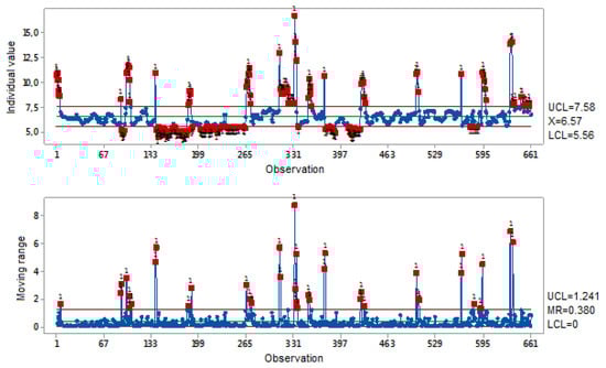 Finally, when creating individual and moving range charts (moving range is the absolute value of the difference between one value and the previous one) it can be seen that the process mean is not stable (Figure 7). This allows us to say that the difference between different hours’ emissions are not a random phenomenon. Many points are out of control limits UCL and LCL in the individual chart.