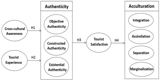 Proposed conceptual model regarding the influence of cross-cultural awareness and tourist experience on authenticity, tourist satisfaction, and acculturation.