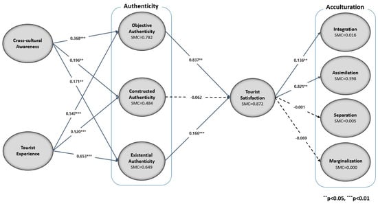 Figure 2 summarizes the estimated results of the proposed research model. Results showed that χ2 = 2235.568 (p < 0.01), df = 1046, χ2/df = 2.137, GFI = 0.811, AGFI = 0.788, NFI = 0.885, CFI = 0.935, RMR = 0.052, and RMSEA = 0.052. When compared with the general fitness index, the model satisfied the level of the benchmark in the study. Therefore, it is suitable for using this model. The results of SEM are shown in Figure 2 and Table 5. The square of coefficient of multiple correlations (SMC) could reflect an explanatory variance of each variable. Cross-cultural awareness and tourist experience could explain 78.2%, 48.4%, and 64.9% of the variances in objective authenticity, constructed authenticity, and existential authenticity, respectively. Authenticity could account for 87.2% of the variance in tourist satisfaction. Tourist satisfaction accounts for 1.6%, 39.8%, 0.05%, and 0.0% of the variance in integration, assimilation, separation, and marginalization, respectively.