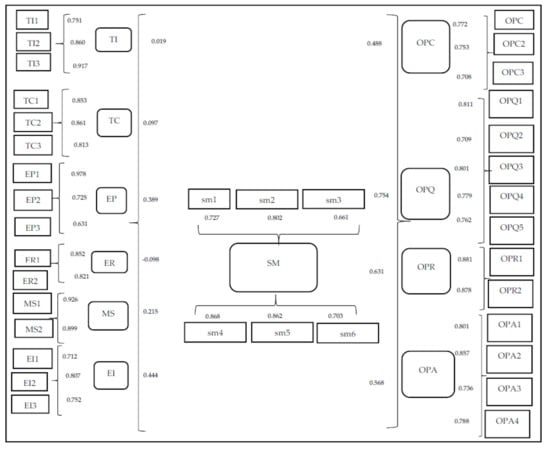 Structural model with path coefficients (b) and adjusted R2 values. Note: TI—technology infrastructure; TC—technology competence; EP—environmental pressures; ER—environmental regulations; MS—management support; EI—employee involvement; SMP—sustainable manufacturing practices; OPC—cost; OPQ—quality; OPR—responsiveness, OPA—adaptability.
