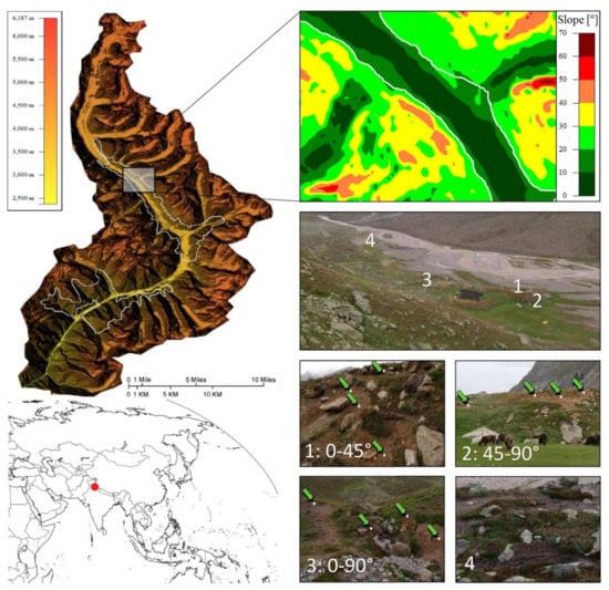 Miyar Valley in India’s Himalayan region, and the location of the study area and its slope distribution. The grass/grazing area is marked by the white line. 1–4 study polygons. Location of the measurement pins depending on the degree of the slope: (1) 0–45°; (2) 45–90°; and (3) excluded comparison (control) area (0–90°). (4) The locations of the two polygons (polygon A and B) designated in order to check vegetation destruction and path widening.