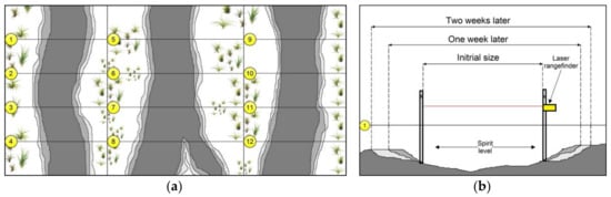 (1) In order to examine the extent of damage to surface relief caused by livestock and its impact on the erosion process within the studied area we undertook the following procedure. First, we checked the indirect influences. We designated two polygons (A and B: each one 2 × 4 m; Figure 2) on the paths that are used by livestock while moving to their grazing place. We then identified the plants, and calculated the number of plants and the number of stems for each plant. The same polygons were used to investigate the development of the paths. The width of the path was measured using a cord (four of them). Each of the four cords was pulled through the polygon and then divided into three small sections, thus twelve sections were created in each polygon (Figure 2a). The exact width of the path was marked on the cord. While the cord was above the path, we used a spirit level to mark the width properly (Figure 2b). The measurements were taken using a laser rangefinder, DLE 50 Professional, from Bosch (measuring accuracy: +/−1.5 mm). They were then checked and re-measured with a measuring tape. After the measurements were taken all cords were removed, leaving the pins secured with rocks for later observation. One and two weeks later the measurements were repeated in order to observe changes (plant survival and path development). Later, the number of stems and plants were converted into percentages, and changes in path widths were indicated in centimetres. The data obtained was then graphed.