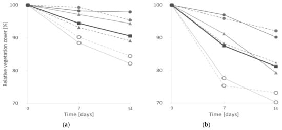 Correlation between time of grazing and/or being trodden (X-axis) and relative vegetation cover (Y-axis) of Persicaria affinis (●); Potentilla argyrophylla (▲); Astragalus Himalayanus (○); and total (■) (a) decline in the number of plants, and (b) decline in the numbers of stems. Data for Polygon A is marked with a solid line, while Polygon B with a dotted line.
