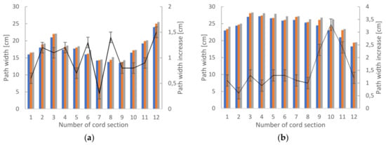 While moving to and returning from grazing sites, livestock create paths or widen existing ones. Figure 4 shows the speed of these changes for both polygons (A and B) as a set containing twelve measurements with a cord. In all cases the paths were wider after one to two weeks of exposure to livestock impact. The average changes for polygons A and B were 1.0 and 1.5 cm, respectively. The maximum value of change was 14.3% (3.3 cm) for the increase in path width. In accordance with this, each part of the path became approximately 6% (AM: polygon A = 5.7% and B = 6.3%) wider than it was when observations started.