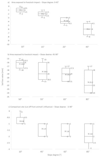 A boxplot of the data from the soil loss experiment according to the slope’s degree of inclination. Values from the exposed (a,b) and comparison areas (c).