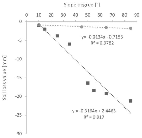 The results from the experiment were placed on a graph and a linear trend line was drawn (Figure 6). To determine the regression model of best fit for the data gathered, the R-squared value (coefficient of determination) was checked. In general, the higher the R-squared (range: 0–1), the better the model fits the data. Linear regression analyses were performed to identify the mathematical models that best approximated the relationship between soil loss (y) and slope gradient (x). For this study, the R-squared value was 0.92 for the area exposed to animal activity and 0.98 for the comparison area. The mathematical models that describe the changes are presented below: