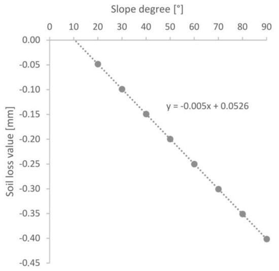 The elaborated mathematical models for both study cases, the exposed area Equation (1) and the comparison area Equation (2), provided an opportunity to compare data from the experiment (Table 2) with those from the model (Table 3). The elaborated model, even if not ideal, shows a similar trend for the changes. In the experiment the slope with a gradient of 50 degrees lost 13.4 mm of soil, while the model shows a loss of 16.4 mm (compare data from Table 2 with Table 3). This data, however, still illustrates only the case study, that is, the impact of three livestock types (sheep, goat, cattle) showing various static pressures on the ground (Table 1).