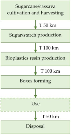 Life cycle stages of the studied bioplastic boxes.