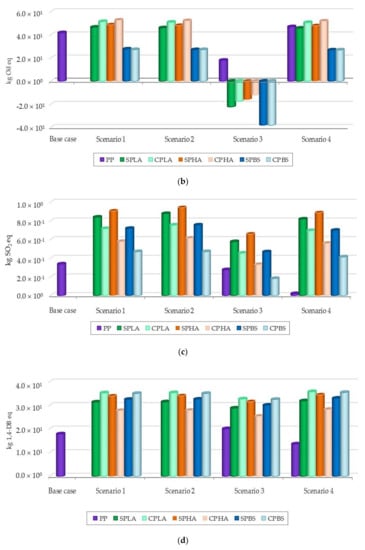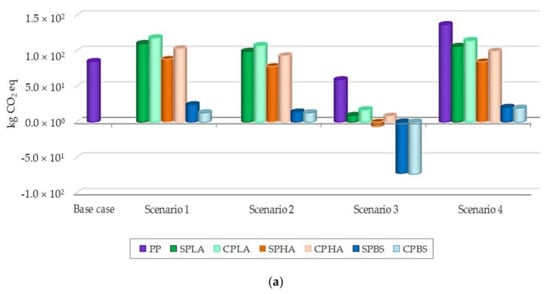 Figure 3 shows the life cycle environmental impacts associated with the boxes considering different EOL scenarios and different types of feedstock. In this study, carbon dioxide fixation during cultivation of feedstocks was considered. It can be clearly seen that, under the EOL scenario of 100% recycling, GWPs of all bioplastics exhibit lower values. This is because the requirement of virgin resin is reduced, consequently offsetting the GWP of producing virgin resin. Comparing the different types of bioplastics considered in the study, PBS showed lower GWP compared to PLA and PHAs due to the lower amount of electricity required in the PHA resin production process. Within the same kind of bioplastic, sugarcane-based bioplastics always showed lower GWP than the cassava-based ones. This is because of the use of bagasse and molasses to produce electricity and bioethanol, respectively. Thus, the environmental burdens from the producing of sugar at the sugar mills are allocated between the co-products, thus reducing the burdens on the raw sugar used for the bioplastics production.
