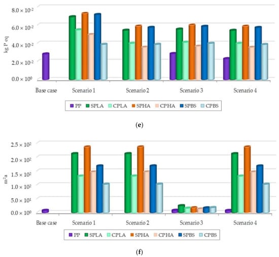 For the other impact categories, bioplastics showed higher impact as compared to PP. This is because of the acquisition of feedstock and the intensive energy used during resin production. The calculations showed that the resin production stage is the main environmental impact contributor followed by the box forming stage. During feedstocks’ cultivation, fertilizers and pesticides are applied in the field leading to higher eutrophication potential. Growing of feedstocks for bioplastic production requires arable land; therefore, the LOP of bioplastics boxes was much higher than for PP boxes. Considering of different EOLs showed that the 100% mechanical recycling scenario had lower LOP for all bioplastics because, for the use of recycled material, land is not required for producing feedstocks.