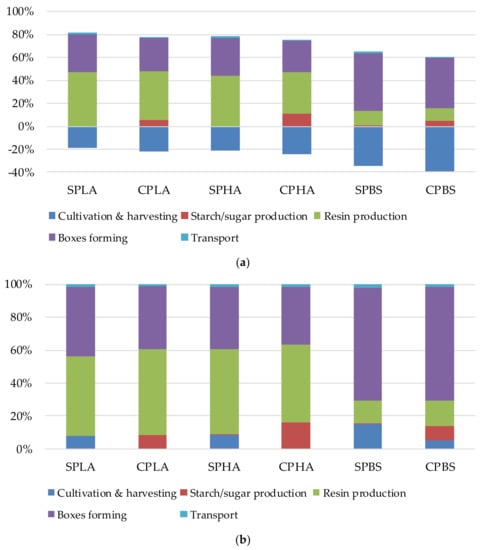 Another point to consider is the stages in the life cycle of the bioplastics that contributed largely to the environmental impacts. Figure 5 shows the GWP and FDP profiles of the boxes studied. It can be seen that GWP of PLA and PHA boxes was contributed to largely by the resin production stage followed by the boxes forming stage. The results are in line with a previous study that used corn as a feedstock for bioplastic resin production [10]. This is due to the intensive use of electricity. Moreover, the use of chemicals, such as lime, in the process also makes a major contribution to the GWP. During cultivation of feedstocks, CO2 in the atmosphere is fixed by sugarcane and cassava through photosynthesis. For PLA, PHAs, and PBS, the amounts of 1833.5, 2199.1, and 2046.0 kg CO2 per kg resin were fixed. As a result, GWP during cultivation and harvesting exhibited negative results. At the sugar mill, bagasse, molasses, and filter cake were utilized for electricity generation, bioethanol production, and fertilizer, respectively. Consequently, the GWP was relatively low. Likewise, the FDP was also contributed mainly by the resin production stage followed by boxes forming. This was due to the use of electricity. However, it can be noticed that boxes forming showed higher impact than other life cycle stages for the case of PBS. The main reason is that the electricity consumption required for PBS resin production is lower than the other two types of bioplastic.