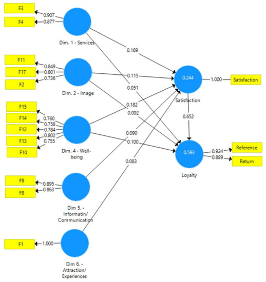 Figure 1 presents the structure of statistically important relations among the dimensions of destination quality, overall satisfaction with the destination, and the loyalty towards the destination. The basic model presumed that the dimensions of quality are indicated by all 19 research factors from Table 3. However, some dimensions do not meet the condition of the minimal Crombach alpha value (if it is not “0.7”) and this means that there is not the appropriate correlation between some manifest variables and the relevant latent variable. This can be caused by an insufficient diversity of answers among the respondents. The following factors were removed from the model (Figure 1): F5 (dimension 1); F16 (dimension 2); F6, F7 (dimension 3); F18, F19 (dimension 6).