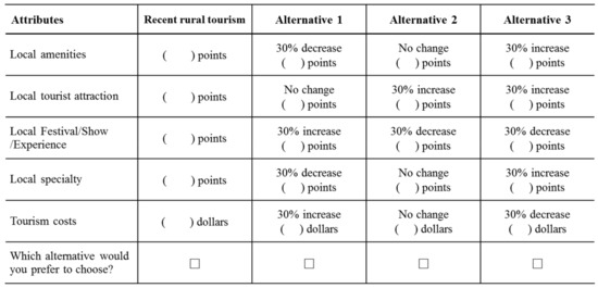 This study uses a pivot-style (or reference) design approach in order to develop rural tourism choice experiments. In this pivot-style choice experimental design approach, attribute levels are drawn based on specific experience or knowledge of respective respondents [13,29]. Choice alternatives associated with the combination of tourism attributes are given to the respondents. Among the choice alternatives, one is related to the status quo which serves as the reference alternative. The rest are associated with new and hypothetical alternatives in which attribute levels are altered from the reference alternative. In accordance with individual respondents’ current situation (or reference levels), they are, in other words, confronted with customized choice scenarios. Kim et al. [30] stated that the pivot-style design method has a distinct feature from other design approaches in generating choice sets. Rose et al. [29] also mentioned that there are many benefits to the use of the pivot-style design as respondents are allowed to disclose their preferences more effectively. This is based on support of multiple theories, e.g., prospect theory, case-based decision theory, and minimum-regret theory.