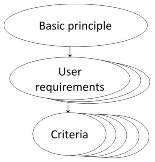 Every manual of the INPRO methodology covers one of the areas relevant to the sustainable development of NESs. A key objective to be achieved in a given area is formulated as the INPRO basic principle. The structure of the methodology is the same in all areas of assessment, as presented in Figure 1. Basic principle splits into a few user requirements associated with the actions needed to achieve the system sustainability. Every user requirement consists of a few criteria to be used by the assessor to make judgement on the fulfilment of user requirement. Every criterion comprises an indicator and corresponding acceptance limit.