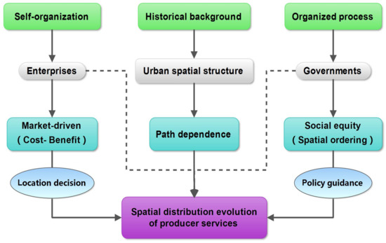 The influencing factors that affect the spatial evolution of producer service sectors can be divided into three major categories: enterprises (market-driven), urban spatial structure (path dependence), and governments (spatial ordering). The enterprises provide location decisions for the spatial evolution of producer service sectors, and the governments provide policy guidance. Therefore, we construct a study framework (Figure 1) to assess the spatial evolution of producer service sectors and its influencing factors in cities using the case study of Hangzhou, China.
