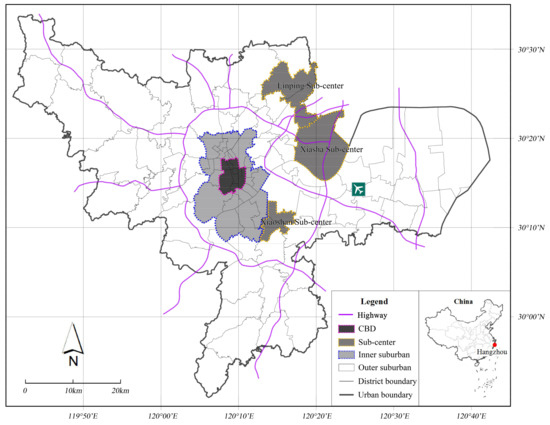 In this study, 95 streets (areas) in the main urban areas of Hangzhou are divided into four groups, namely: CBD, sub-center, near suburban, and remote suburban (Figure 2). The current central city is the main built-up urban area of Hangzhou prior to 1949, the start of the People’s Republic of China, and consistent with the urban administration management scope of 1982. This central city is considered as the CBD of Hangzhou today. The sub-center is determined in Hangzhou’s 2004 version of overall planning. Rear and remote suburban areas are divided according to the density of the population, and the population density of near suburban areas is higher than that of remote suburban areas.