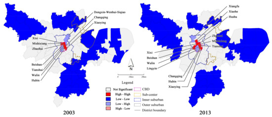 Low–high area mainly refers to areas that are significantly different from their peripheral neighbors, which mostly were Shiqiao–Wenhui and Dongxi Street. These streets are the main areas expanded by the city over the past few years, and Beishan Street, which has scenic spots and parks in 2003. In 2013, this area also included Xiangfu Street, which is a commercial and economic agglomeration area that emerged in recent years.