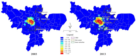 This study uses the kernel density function (KDF) to calculate the magnitude per unit area based on points and polylines to fit each point and polyline into a smooth surface [46]. This approach helps prepare occurrence probability maps and identify agglomeration phenomena in research areas. This method is described in the study of Silverman [47]. This study utilizes the statistical values of producer service sectors in each street in Hangzhou in 2003 and 2013. Estimation and a smoothing treatment were conducted through KDF functions, and density values were divided into 10 grades. Changes in the spatial distribution of Hangzhou’s producer service sectors were also explored.