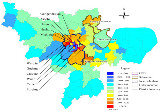 Agglomeration areas for producer service sectors are established, and professional function areas for service sectors have gradually formed. The master plan of 2004 determined the new main center of the city (Qiangjian CBD) and three sub-centers (Linping, Xiasha, and Xiaoshan) as a peripheral agglomeration area for producer service sectors [59] (Figure 7). Many professional agglomeration areas for producer service sectors, such as Cuiyuan and Xixi streets, were planned in the near suburban area. These streets are centered on information and computer services, Jiubao and East railway station focused on transportation and a number of university research parks that are distant in CBD are based on science research and technical services, such as logistics, Liuxia, Gudang, Binjiang. In addition, the government proposed a plan in 2008 to build “100 city complexes”, which are all distributed in the near suburban area, including high-proportion office buildings. After nearly a decade, the construction of the planed office buildings has been basically completed. For example, streets in the near suburban area, such as Dongxin, Xiangfu, Beishan, are areas in which mass office buildings have been completed over the past few years.
